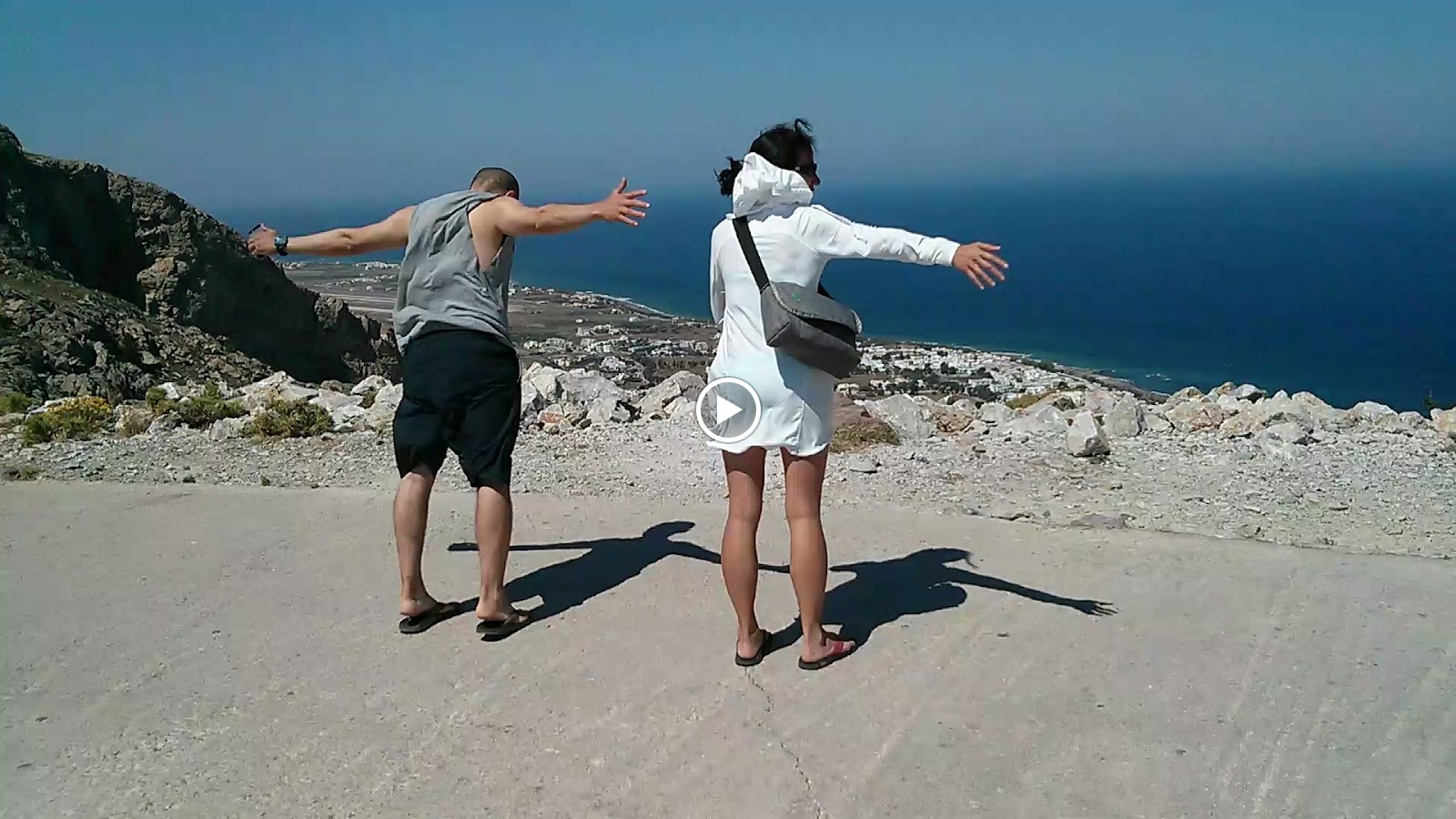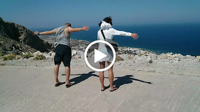 After we eventually got the lunch bill and paid (it always seemed to take a really long time to get the bill on this trip, especially in Santorini - this was by far Tina's least favorite part of dinners out), we took the quads up the nearby hill (Mesa Vouno) where Acient Thera apparently sat. The road up was a crazy zig-zag which turns around about 20 times. The top of the Sellada Pass was *extremely* windy, so we decided (out of an abundance of caution, or perhaps fear) not to continue up the walkway to the top of the hill.. None of us could hazard a guess at exactly how fast the air was moving there, but we suspect that the gusts reached hurricane speeds.